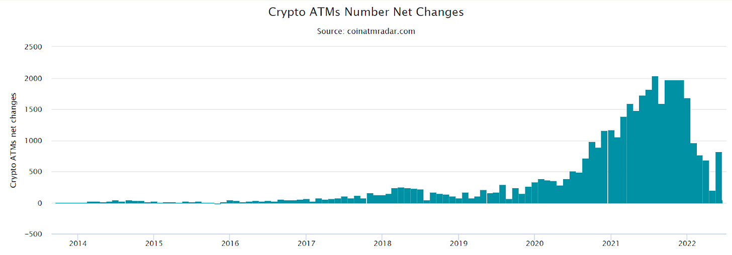 However, as you can see on the right side of the graph, this trend began to reverse over the last five months, ending with only 202 Bitcoin ATMs set up in May 2022, the lowest number of new machines since 2019. Surprisingly enough, 817 ATMs have already been set up in June.