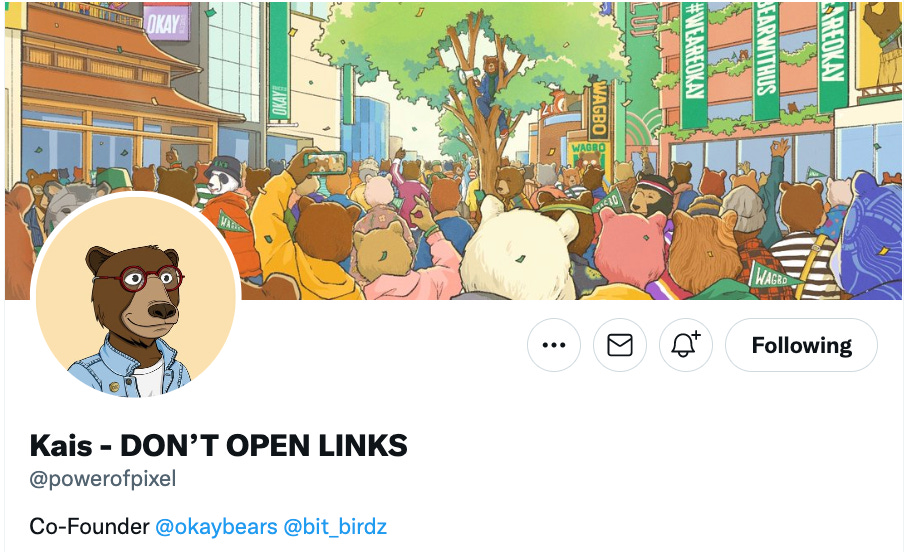 Although the recent hack was basically unavoidable, given the scammer was sending messages from one of the community managers’ official accounts, one should never click on any links that are messaged to you directly. Hackers love to create fake accounts mimicking project creators, buy Twitter followers to seem legit, and then message people who are new to the NFT space with phishing links. If you don’t believe how vital this talking point is, simply look at OkayBears’ cofounder’s official Twitter bio.