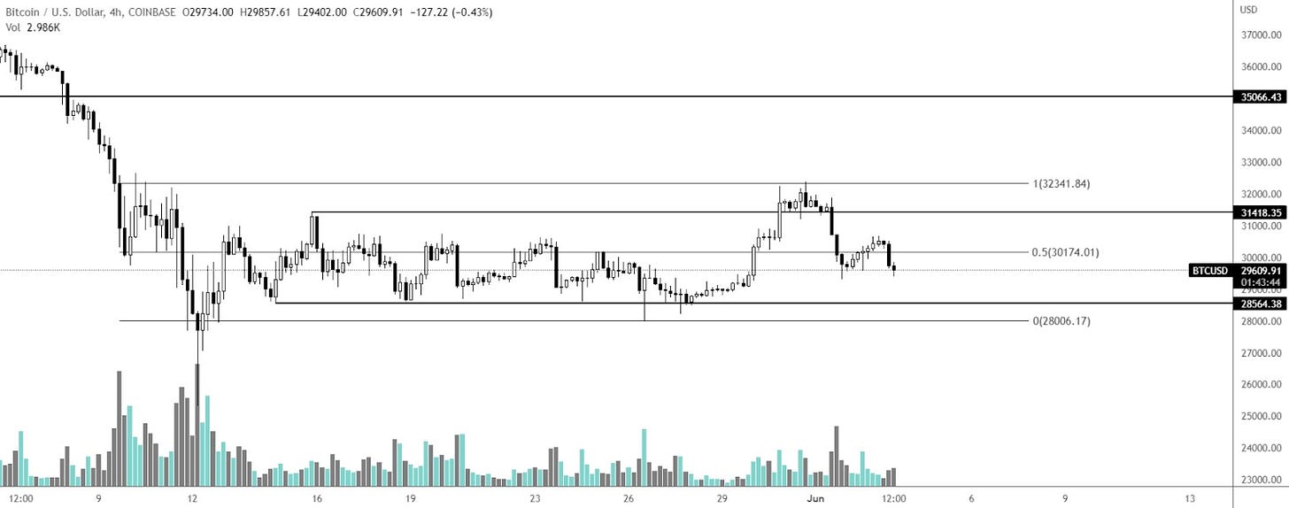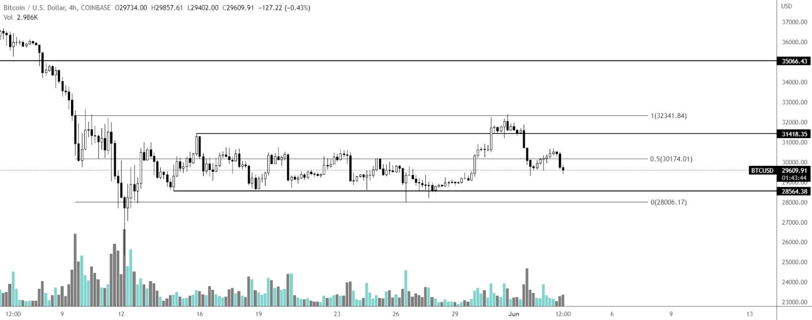 Bitcoin closed above $29,450 ($31K at the time of writing this) come Sunday night, which means it recorded its first weekly green candle since March. Although the green candle indicator is positive, Bitcoin continues to be stuck in a range of roughly $28K to $31K since early May, as CoinTelegraph’s chart depicts.