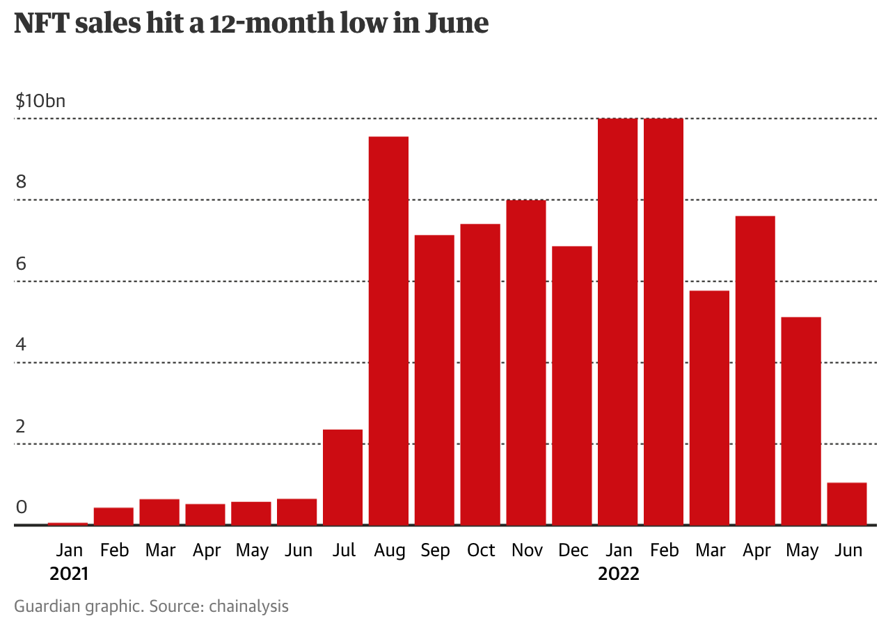 Total NFT sales amounted to over $1B in June. Although that number may seem large, it represents a one-year low for NFT sales.